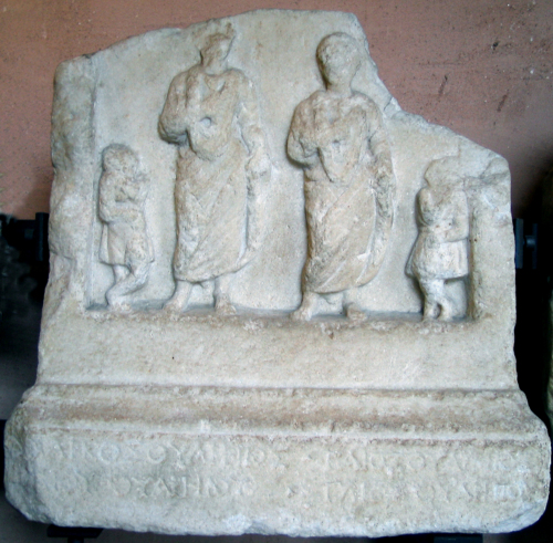 Tra i caratteri epigrafici si notano l'alpha a sbarra spezzata e l'omikron a volte rimpicciolito; l'assenza del cognomen nell'onomastica dei personaggi induce a datare a stele alla prima età imperiale. I nomi e i patronimici dei due personaggi sono separati da triangoletti incisi. Evidentemente i defunti dovevano essere fratelli e la differente altezza, qualora non fosse un espediente tecnico per dare varietà alla composizione, potrebbe indicare la loro diversa età.
