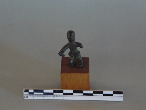 Bronzetto di devota/ offerente, la testa ha un profilo subcircolare, occhi e labbra appena accenate, naso prominente. Il corpo ha tratti schematici, le braccia sono allargate e nella mano destra tiene un recipiente di forma allungata, i piedi risultano grandi. Indossa una gonna svasata e a bordo ingrossato.