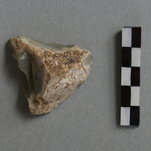 Raschiatoio carenoide su spessa scheggia corticata, a ritocco semplice diretto trasversale e sopraelevato diretto margine destro.