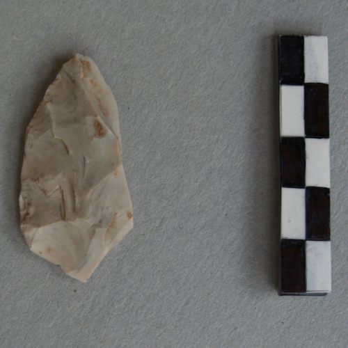 Frammento di strumento foliato, forse una punta a base semplice, a ritocco piatto bifacciale coprente e invadente.