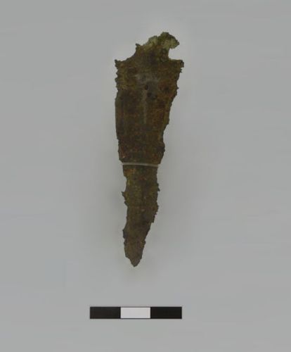 pugnale in bronzo, a base semplice a profilo probabilmente arrotondato a tre fori, base in continuità con la lama, triangolare corta, a costolatura mediana poco accentuata e sezione romboidale
