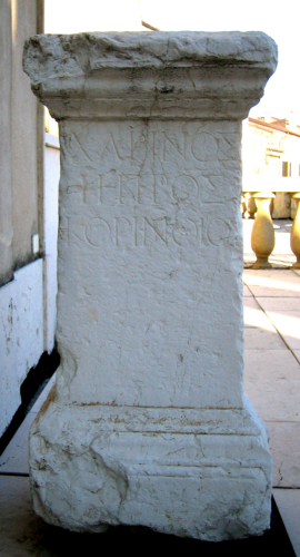 L'epigrafe è incisa sulla metà superiore della fronte, con lettere grandi e curate, tratti sottili e leggere apicature. La formula contiene solo il nome del defunto, la sua qualifica di medico e lindicazione della sua origine. Charinos, presumibilmente, si stabilì in Italia ad esercitare la sua professione, secondo una consuetudine dei medici greci, che spesso viaggiavano lontano dalla loro patria. Il Maffei ritenne che sede dell'attività di Charinos fosse stata la stessa Verona, dal cui territorio proverrebbe quindi la pietra. Secondo T. Ritti l'opinione del Maffei non può essere oggi verificata, ma l'appartenenza del monumento all'area dell'Italia settentrionale appare comunque probabile. L'epigrafe venne respinta dal Kaibel, che la escluse dalla sua opera, e dubbi sulla sua autenticità furono avanzati anche da L. Franzoni, sia per il giudizio del tedesco, sia perché non si possiede alcuna indicazione sulla sua provenienza. Recentemente A. Buonopane ha rivalutato l'iscrizione come genuina, in seguito soprattutto all'analisi del materiale lapideo, rivelatosi calcare bianco ammonitico estratto sulle colline veronesi.