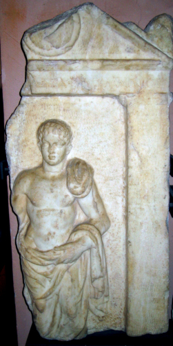 Confronti iconografici per questo tipo di rilievo si possono trovare anche nei particolari (pettinatura, disposizione del mantello sulla spalla, atteggiamento della figura) in alcune stele attiche coeve raccolte dal Conze. I piccoli apici, l'alpha a sbarra spezzata, il prolungamento dei tratti obliqui oltre gli incroci appaiono caratteristici della prima età imperiale. Il nome del defunto è perduto: resta solo la terminazione del patronimico, che si può integrare qausi con certezza, e l'indicazione della provenienza da Salamina, che ci assicura l'origine attica della stele.