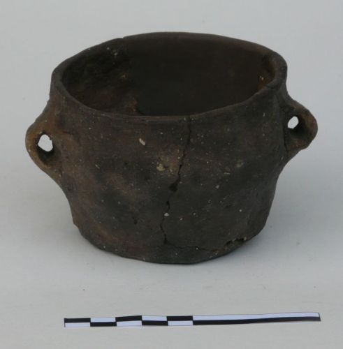 bicchiere troncoconico con orlo liscio, parete rettilinea, fondo piatto diritto, con due piccole anse a nastro verticale e due presette plastiche a linguetta impostate sulla parete sotto l'orlo in posizione contrapposta