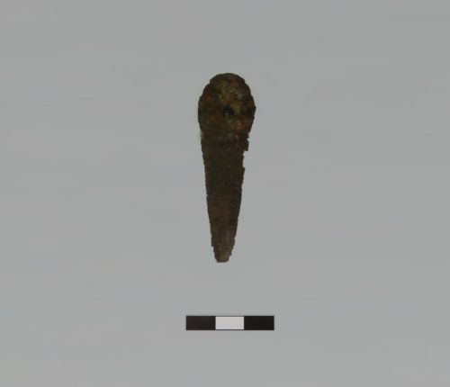 pugnale in bronzo, a base semplice a profilo arrotondato/ovoidale, due fori distanziati, base in continuità con la lama, triangolare corta, a costolatura mediana e sezione romboidale