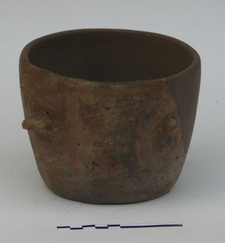bicchiere troncoconico con orlo liscio, parete leggermente convessa, fondo piatto diritto, con due presette plastiche a linguetta e due bugne coniche impostate sulla parete in posizione contrapposta