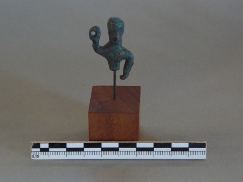 Bronzetto di guerriero stante, testa ha profilo subcircolare, tratti del volto appena accennati. Il corpo è trattato in maniera sommaria, il braccio destro termina ad anello cui doveva essere infilata originariamente la lancia.