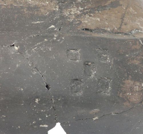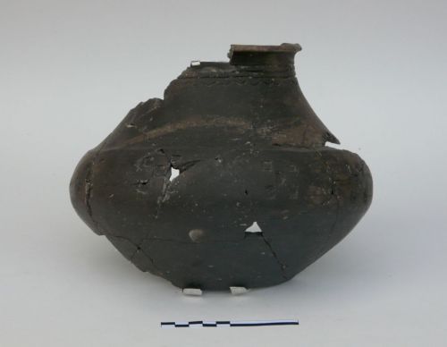 olla biconica con vasca a profilo troncoconico, risega sopra il punto di massima espansione, parete superiore rettilinea e orlo estroflesso, decorata subito sotto l'orlo da incisioni a zigzag e linee orizzontali e sul punto di massima espansione da cinque rettangoli excisi disposti a croce