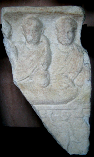 Le pupille incise e rivolte verso l'alto offrono un indizio per la datazione all'età imperiale avanzata. Il rilievo è seguito con una certa rozzezza e la Felder ha addotto come confronto un pezzo assai simile con la raffigurazione del consueto banchetto funerario a due personaggi conservata a Paro e che la studiosa attribuisce alla medesima officina del pezzo in esame.