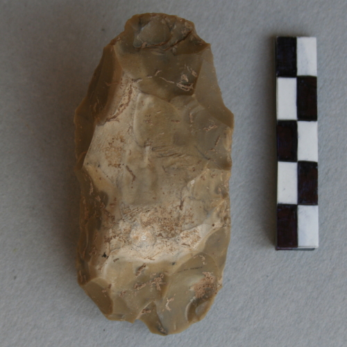 Pic campignano a ritocco sommario, profilo ellissoidale, sezione biconvessa. Presenta tracce di cortice. Presenta tracce di cortice.