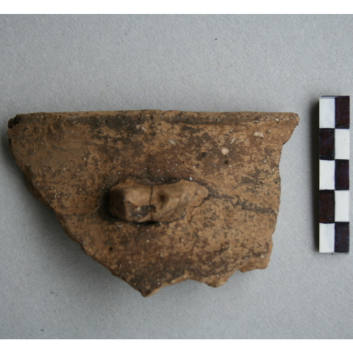 1 frammento di vaso a collo con presa a linguetta su decorazione a cordone a motivo a doppio arco.