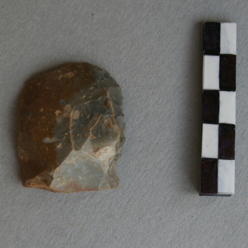 Grattatoio frontale corto a ritocco bilaterale bifacciale su frammento di scheggia. La fronte è frammentaria.