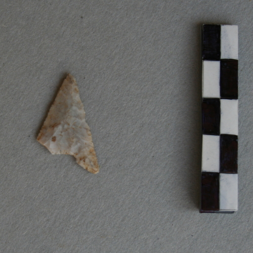 Punta di freccia foliata a base concava ed alette, a ritocco piatto coprente bifacciale. Frammentaria l'aletta di sinistra.