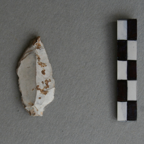 Punta a ritocco semplice profondo bilaterale su piccola scheggia patinata. Il ritocco intacca la spessa patina biancastra.