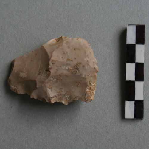 Raschiatoio foliato multiplo su spessa scheggia trapezoidale, a ritocco piatto grossolano, bifacciale. Tracce di cortice.