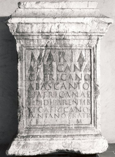 L'iscrizione menziona individui di condizione libertina appartenenti ad una stessa famiglia. Che si tratti di liberti, è facilmente desunibile dalla mancanza della figliazione e dai nomi stanieri che presentano (Africanus e Africana). L'ara si data al II secolo d.C. sulla base dei caratteri paleografici delle lettere, dell'onomastica (anticipazione del cognomen al nomen nell'onomastica femminile Maria Africana e impiego di un cognomen, Maria, non tipicamente romano e affermatosi non prima del II secolo d.C.) e del formulario adottato (fratri bene merentis).