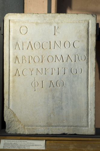 I caratteri epigrafici sono curati, con tratti larghi ed apicati. La forma variabile del kappa, di tipo non comune, e in generale l'aspetto calligrafico delle lettere, con taluni tratti assottigliati con effetto chiaroscurale, possono far dubitare dell'autenticità dell'iscrizione. D'altra parte, a formula funeraria e l'onomastica dei personaggi sono corrette. La presenza del nome Habrokomas, inoltre, essendo abbastanza raro, è anch'esso un elemento a favore della genuinità del pezzo.