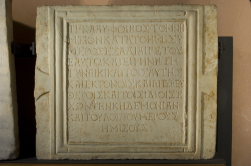 Le lettere dell'iscrizione sono alquanto curate, di grandezza e allineamento più regolari all'inizio del testo, meno alla fine; le apicature sono piuttosto accentuate. Nelle prima riga gli elementi onomastici del defunto sono separati da segnetti triangolari. Tra i caratteri epigrafici si può notare l'uso di un trattino orizzontale sopra l'alpha e il lambda e la terminazione della curva del rho in un ricciolo, tipica dell'età antoniniana. Il testo ricorda la condizione giuridica del sepolcro, una metà del quale è indivisibile e spetta alla famiglia del defunto, mentre egli si riserva la "kedemonia", cioè la curatela, dell'altra metà, forse destinata ad un altro ramo della famiglia o alienata. L'insistenza sui particolari giuridici riguardanti il possesso legale della tomba è una caratteristica che secondo T. Ritti riporta questa epigrafe all'area microasiatica.