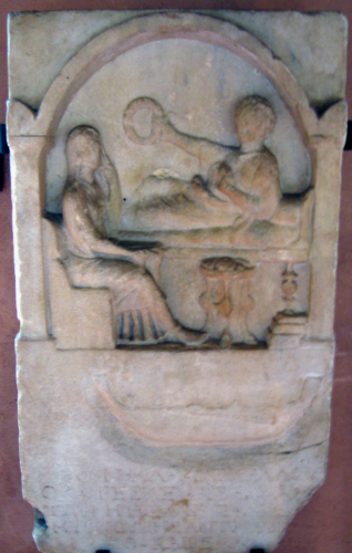 figura femminile seduta su un seggio ad alta spalliera (a sinistra) e uomo adagiato su una kline che le porge una corona; di fronte alla kline, una mensa imbandita. Al di sotto del campo del rilievo, una navicella con prua e poppa ricurve.