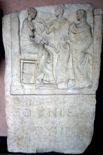 Nel testo è andato perduto il nome della defunta, mentre restano il nome e demotico del marito. La presenza di quest'ultimo assicura la provenienza attica del monumento; anche il nome Olympichos, pur diffuso in varie regioni della Grecia, è particolarmente attestato in Attica. Il gesto affettuoso dell'uomo lo indica come figlio della defunta; lo stile del rilievo mostra un classicismo manieristico: le figure appaiono allungate e prive di corporeità, le pieghe del panneggio dominano la composizione, l'altezza della donna è stata aumentata per accentuarne l'importanza. I caratteri epigrafici hanno altezza e spaziatura irregolari. Si notino il pi con i tratti verticali di uguale lunghezza e quello orizzontale sporgente ai lati, e l'omega con le appendici a triangolo, che rimandano all'età adrianea.