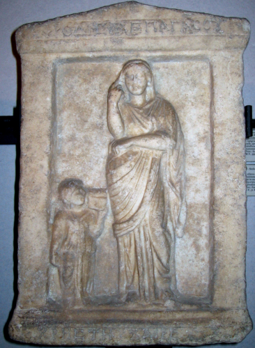La pienezza massiccia della figura principale e la pesantezza del panneggio sono caratteristiche del primo ellenismo, ma già si notano la leggerezza e la trasparenza del mantello, che riconducono ad un'epoca più tarda. La seconda riga dell'iscrizione è incisa sullo zoccolo della stele; si notino, oltre all'alpha con la sbarra spezzata, il sigma quadrato e il theta tagliato da una linea orizzontale: le ultime varianti sono innovazioni che troveranno ampia diffusione in età imperiale. Nella prima riga, le lettere hanno altezza decrescente. Il testo epigrafico, assai semplice, riprende lo schema di saluto al defunto usuale nell'età ellenistica e nellarea microasiatica.