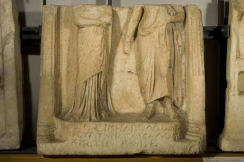 L'iscrizione, incisa nello spazio tra le due colonnine, occupa un basamento ricurvo che suggerisce la presenza di un podio su cui le figure si elevano. Per quanto riguarda i caratteri epigrafici, che concorrono a stabilire la datazione, si noti la presenza dell'alpha a sbarra spezzata, il pi col terzo tratto uguale al primo e l'andamento assai irregolare delle lettere. L'attribuzione a Renea è stata avvalorata dalla Couilloud in considerazione della qualità del marmo e dei caratteri stilistici del rilievo. Il folto gruppo di stele delie che presenta colonnette simili a quelle del pezzo in oggetto è caratterizzato nella parte superiore da un frontone arrotondato o a forma di tempietto. E' quindi probabile che anche il marmo veronese avesse un coronamento a naiskos o con decorazione vegetale. E' il Gori a testimoniare della presenza della stele nelle collezioni medicee, prima del trasporto a Venezia, documentato, invece, dal manoscritto di G.A. Astori. Per i precedenti passaggi dal luogo d'origine, interessante il Kaibel che annota "Propter Andreinum auctorem inter Neapolitanas rettuli; fortasse tamen ex Grascia potius adlata inscriptio".