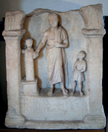 L'iscrizione presenta lettere di grandezza variabile, allineate irregolarmente. I tratti sono ingrossati alle estremità e apicati; è presente l'alpha a sbarra spezzata e l'omikron è rimpicciolito, soprattutto nella prima riga. Le rappresentazioni di erme su piastrini accanto ai defunti sono diffuse in una vasta area, che comprende l'Asia Minore, l'Attica e il Peloponneso, la regione tracio-macedone e le Cicladi. A Renea, le erme sono quasi costantemente associate a figure di morti in età giovane. Sono state avanzate varie spiegazioni per ciò: la più convincente ne sottolinea il valore di segnacolo tombale, cioè l'elemento che caratterizza l'ambiente della necropoli in cui è situata idealmente la rappresentazione sulla stele. In alcuni casi si nota peraltro una certa somiglianza tra i tratti dell'erma e quelli del defunto.
