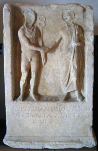 figura maschile stante con attributi divini compie il gesto della dexiosis con una figura maschile stante in posizione frontale