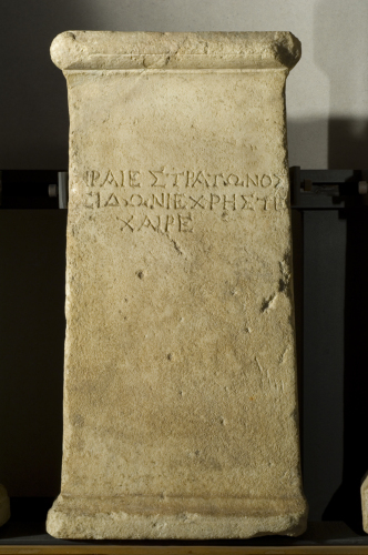 L'iscrizione è incisa poco più in alto della metà della stele, con caratteri lievemente apicati, tra i quali è da notare l'alpha a sbarra spezzata e l'omega rimpicciolito, con le appendici laterali molto apicate. L'attribuzione a Rhenea si basa soprattutto sull'etnico del defunto, che ricorda i legami commerciali intercorrenti fra Delo e l'ambiente orientale. Altri cittadini di Sidone ebbero, del resto, sepoltura a Rhenea.