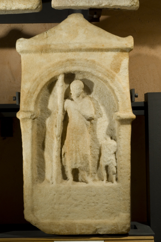 Stele coronata da un frontone, sotto il quale un arco è sostenuto da due pilastrini con mensola. Il rilievo, compreso in un campo incavato all'interno dell'arco, posa su un podio che occupa lo spazio inferiore tra i pilastrini.