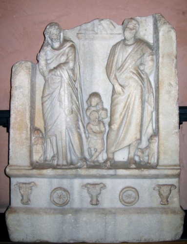 Stele rastremata verso l'alto, con alto zoccolo; il rilievo è compreso tra due lesene con base molto bassa.