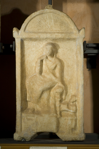 Stele a coronamento semicircolare con acroteri laterali. Il rilievo è compreso in un campo delimitato da lesene.