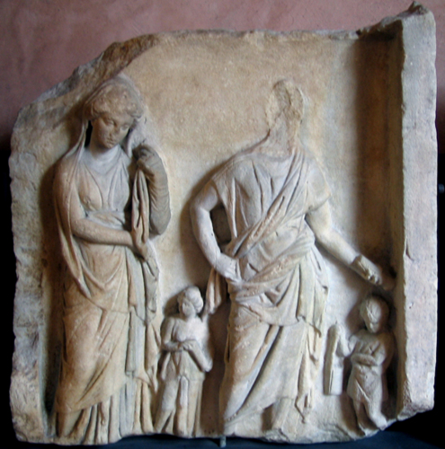 L'iconografia del personaggio maschile trova confronti tra le stele microasiatiche, soprattutto di Smirne, soprattutto per la predilezione per i panneggi complicati. La presenza del rotolo qualifica il personaggio come uomo di cultura. Più diffuso è l'atteggiamento della figura muliebre, che richiama quello della Pudicitia, nella variante cosiddetta Baebia; per quanto riguarda il panneggio, anche per questa figura si possono addurre confronti con altri tipi di figure femminili presenti sovente nelle stele dellAsia Minore.