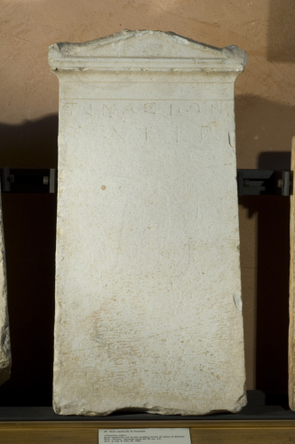 Stele lievemente rastremata verso l'alto, a frontone, decorata appena sotto di esso con due solchi incisi parallelamente. Il frontone triangolare, aggettante, ha una cornice finemente scolpita e, in origine, era ornato da acroteri laterali, di cui restano alcune tracce.