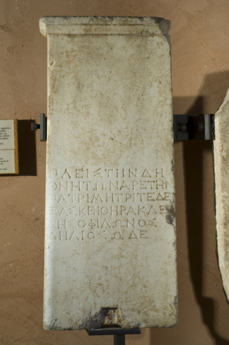 L'iscrizione è incisa con caratteri regolari e curati, ingrossati alle estremità da apici molto evidenti; le lettere tonde hanno dimensioni leggermente inferiori alle altre: questo e altri particolari, come il sigma con i tratti esterni obliqui, il pi con il secondo tratto verticale più breve, il theta col punto, il ksi con il tratto verticale, riportano alla prima età ellenistica. L'epigrafe è metrica e consiste in due esametri. Il defunto è lodato per la dedizione verso i genitori, evidentemente i committenti dell'epigramma stesso. Il motivo della pietas verso padre e madre è abbastanza comune, mentre è raro in questo senso l'uso del termine areté, qui preferito al più comune eusébeia. La menzione dell'etnico del defunto induce ad escludere che egli fosse sepolto nell'isola di Renea, necropoli per gli abitanti di Deo. Si può quindi supporre che l'etnico sia stato aggiunto all'epigramma proprio perché il defunto era sepolto lontano dalla patria, forse come ipotizza la Couilloud in una delle Cicladi.