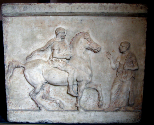 Secondo il Maffei ed il Duetschke, l'iscrizione incisa sul listello superiore potrebbe essere spuria, come sembrano indicare i caratteri esili e malsicuri, l'impicciolimento delle lettere tonde, tipico di un'età posteriore, l'epsilon col tratto verticale prolungato in basso come in età arcaica. Altri elementi, tuttavia, quali il sigma divaricato, il pi col terzo tratto più breve, il ny con l'angolo inferiore ancora sollevato rispetto alla base della lettera, converrebbero alla datazione proposta per il rilievo. Il medesimo schema iconografico del pezzo in esame si ritrova nel rilievo anepigrafe attico della collezione Giusti di Verona. L'appesantimento delle forme, soprattutto nella figura del dedicante e nella testa del cavaliere, rinvia alla Beozia e soprattutto all'area di Tanagra, che attesta il medesimo tipo.
