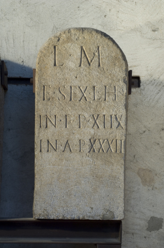 Gentilizio e cognomen appaiono indicati solo attraverso liniziale. Il cippo proviene da una zona, quella di Aquileia, per la quale a livello funerario, è ampiamente documentato luso di abbreviare lonomastica dei personaggi delle iscrizioni, onomastica che risultava facilmente ricavabile dalla lettura di iscrizioni tombali poste nelle vicinanze. Ragioni paleografiche inducono a proporre per questo cippo una datazione al sec. I d.C.
