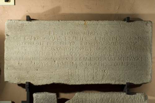 Lastra rettangolare con iscrizione sulla fronte e, al di sotto di quest'ultima, una clava incisa orizzontalmente.