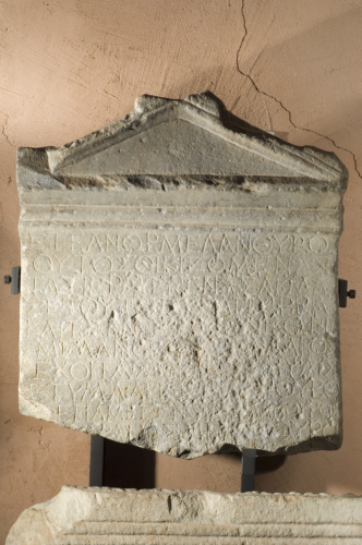 Stele con cornice modanata coronata da un frontone con acroteri (oggi mancanti).
