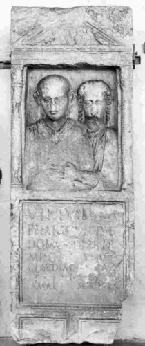 La stele presenta frontalmente una nicchia di forma rettangolare dalla quale emergono in rilievo i busti di un uomo e di una donna con tuniche drappeggiate e mantello. La donna sembra avere la mano destra poggiata sulla spalla destra delluomo, mentre la mano sinistra sembra intrecciata con quella destra delluomo sul petto di questultimo (scena di iunctio). I tratti del volto di entrambi sono molto rovinati da sbrecciature diffuse, specie naso, fronte e, nel caso della donna anche il mento, del tutto scalpellato. Luomo è ritratto con capigliatura corta e compatta, lineamenti raffinati, orecchie scostate dal capo, occhi sporgenti e con palpebre superiori e inferiori molto evidenziate. La donna ha una ricca acconciatura a riccioli sulla fronte e sulle tempie e due trecce ricadono ai lati del collo. Ai lati della nicchia, poco profonda, due colonnine tortili con capitello corinzio, molto sbrecciate nel fusto. Al di sopra della nicchia, da questa separato mediante cornice a listello e gola, un frontoncino contornato da cornice a listello e gola rovescia sui due lati montanti, nel cui timpano è rappresentata una scena assai rovinata da scalpellature ed erosione lapidea: sembra riconoscibile una figura maschile nuda, disposta frontalmente, ai lati della quale si notano un serpente (alla sua destra) e un volatile (alla sua sinistra) (Orfeo?). La parte superiore del frontone risulta completamente consunta, specie verso lestremità sinistra, così come assai rovinati sono i tasselli, nei quali sembrano comunque visibili, almeno a destra, motivi decorativi vegetali. Al di sotto della nicchia si trova lo specchio epigrafico, di forma quadrangolare, lavorato a martellina e molto rovinato per desquamazione della pietra, contornato da cornice a listello e gola rovescia, con sbrecciature diffuse sui quattro lati. Infine, nella parte sottostante, evidentemente franta, due riquadri affiancati, corniciati a gola rovescia, lavorati internamente a martellina e probabilmente destinati ad accogliere ulteriori elementi decorativi o iscrizioni. Il fondo della nicchia coi due busti presenta una coloritura brunastra. Interpunzioni di forma triangolare con punta orientata verso lalto a destra. Ductus e modulo abbastanza regolari. Prima riga lievemente addossata a margine destro. Lettere apicate, incise poco profondamente e molto erose. Solco a V. Lunico apice attualmente visibile di quelli segnalati nel CIL si nota sulla seconda O di sorori in ultima riga, come da trascrizione proposta. Mentre il Corpus trascrive Virdomarus in r. 1, il riscontro autoptico rivela che sulla pietra risulta incisa una E al posto della I, dunque Verdomarus.