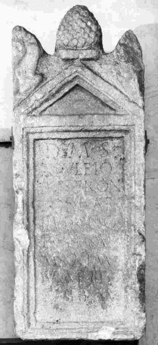 Tutta la stele, lavorata a martellina, si presenta molto rovinata per via di diffuse sbrecciature, ma anche per grave consunzione della pietra, che rende allo stato attuale difficilmente leggibile la stessa iscrizione, le cui lettere paiono quasi evanide. Liscrizione è campita allinterno di una cornice a gola rovescia e listello, variamente sbrecciata. Nella parte superiore della stele, un frontoncino contornato da cornice a listello e gola rovescia nei due lati montanti. Ai lati del frontone, due acroteri gravemente scalpellati ed erosi, per questo difficilmente leggibili nella loro iconografia: forse visibili due palmette. Sul vertice del frontone, una grossa pigna poggiante su supporto lievemente aggettante. Interpunzioni di forma triangolare con punta orientata verso lalto, attualmente però quasi evanide. Lettere apicate, incise poco profondamente, con solco a V, anche queste quasi evanide, specie nella parte iniziale delle prime cinque righe. Code delle Q ricurve e quasi orizzontali. In r. 2, nella trascrizione del Corpus, si legge Appuleio, con una doppia P, ma questo luogo della pietra è molto eroso e non sembra esserci abbastanza spazio per lincisione di due P, dunque dovrebbe leggersi Apuleio.
