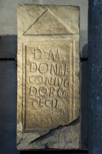 Lo specchio epigrafico è campito in una cornice modanata a listello. Nella parte superiore della stele, figura un motivo decorativo a triangolo inciso, quasi a riprodurre un frontoncino stilizzato. Ductus e modulo estremamente irregolari. Andamento delle righe discendente. Righe epigrafiche addossate verso il margine destro dello specchio. Lettere apicate, incise assai grossolanamente con solco molto largo. Si segnala la presenza della A in r. 4, nella parola Dorcas, laddove nella trascrizione del Corpus (CIL, V, 373) si legge Dorc s.