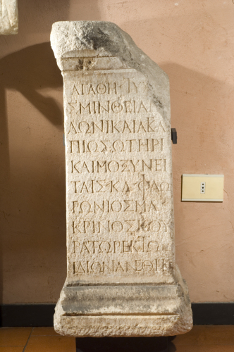 Le lettere del testo appaiono eleganti, incise profondamente e apicate. Si noti la presenza di segni divisori a coda di rondine e la forma barocca dello ksi, tipica delletà imperiale avanzata. Il tau iniziale di Tyche alla prima riga e quello di ton alla penultima sono più alti delle atre lettere, mentre lultima lettera delle ll. 3, 6, 9 e 10 e rimpicciolita per mancanza di spazio; per lo stesso motivo furono introdotte molte legature. Floronios Macrinos, curator di Alessandria Troade, era incaricato di sorvegliare lamministrazione cittadina e volle dedicare laltare a due divinità assai venerate localmente, Apollo Sminteo e Asclepio, entrambi titolari di importanti santuari nella città e strettamente associati ne culto. Nella dedica, oltre a questi dei, si nominano i Mossiniti, nei quali si deve riconoscere non un gruppo di divinità minori, come credette Maffei, bensì gli abitanti di un villaggio o di un sobborgo di Alessandria, così come indicano toponimi analoghi noti in Frigia.