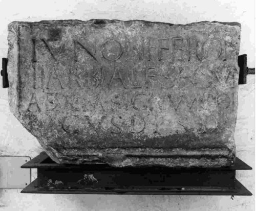 Colei che pone questa dedica, appartiene alla facoltosa gens Barbia, diffusa in Dalmazia, nel Norico e in Pannonia e della quale si conoscono le redditizie attività commerciali. Feronia, antica divinità italica da identificarsi con la Giunone del pantheon romano, veniva in questo caso invocata probabilmente quale protettrice del matrimonio. Tipologia del monumento e paleografia inducono a proporre per questa lastra una datazione al sec. II d.C.