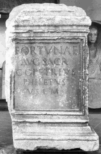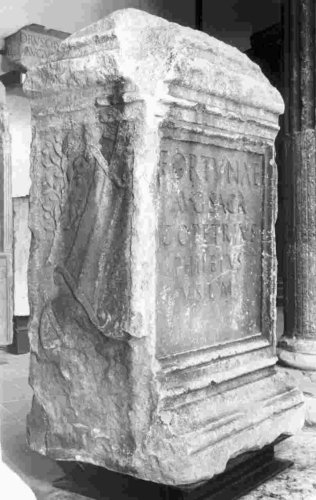 Incerta la provenienza di quest'ara. I dubbi in merito oscillano tra Concordia, Aquileia o Altino. La dedica alla fortuna presente nelliscrizione è sottolineata, nellapparato iconografico, dai simboli più classici legati alla fortuna stessa, quali la cornucopia con lopulenza dei doni che contiene, e la ruota o il globo che indicano la casualità della sorte. Tipologia del monumento, iconografia e paleografia, inducono a proporre una datazione intorno al sec. I d.C.