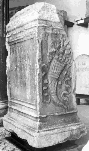 Il fusto quadrangolare è raccordato al coronamento mediante cornice a tondino e listello, mentre risulta raccordato allo zoccolo da modanatura a listello, gola e tondino. Tale modanatura prosegue anche sul fianco sinistro. In questa sede figura una cornucopia con nastro contenente frutta e foglie allinterno di una cornice a listello. Sul fianco destro, un albero, un timone e forse un globo. Specchio epigrafico lavorato a martellina e circondato da cornice a cavetto e gola. Retro grossolanamente lavorato. Nell'iscrizione presenti minute interpunzioni di forma triangolare. Ductus e modulo regolari. Lettere molto apicate, incise profondamente con solco a V. Occhielli delle P aperti.