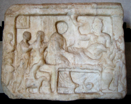 scena di banchetto con personaggio maschile disteso su una kline, familiari/offerenti, servitori e simboli funerari