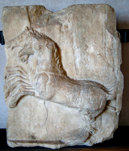 Data la frammentarietà del pezzo, non è possibile ricostruire con certezza la scena nel suo complesso: poteva trattarsi di un episodio mitico di ratto (come nel noto rilievo del Falero), di una rappresentazione trionfale di un eroe su carro, oppure di un rilievo votivo per una vittoria col carro (come nelle gare vittoriose dell'apobateion nei rilievi di Atene e da Oropos). La critica non è concorde sulla datazione del pezzo: Marconi, sulla scia del fregio partenonico, l'ha collocato negli ultimi decenni del V a.C. indicandolo come una produzione attica. Tuttavia, L. Beschi, che non concorda sull'identificazione del marmo come pentelico, ritiene che il linguaggio figurativo del pezzo non trovi confronti nel periodo classico. Il monotono impaccio delle zampe posteriori, il ventaglio aperto di quelle anteriori, l'esecuzione plastica delle redini e dei finimenti secondo lo studioso sarebbero invece indizi di una produzione di epoca ellenistica o addirittura tardo ellenistica e imperiale.