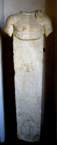 Busto acefalo realizzato fino a metà del torace e delle braccia, con un lembo di mantello appoggiato sulla spalla sinistra. Il corpo dell'erma è costituito da un parallelepipedo rastremato verso il basso, sul quale sono riprodotti a rilievo il sesso e l'orlo inferiore della veste, da cui sporgono i piedi nudi del personaggio raffigurato.