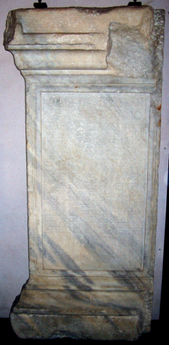 Base parallelepipeda con cornice superiore e basamento modanati con fascia liscia, listelli e gole. Lo specchio epigrafico è inquadrato da una cornice sagomata.